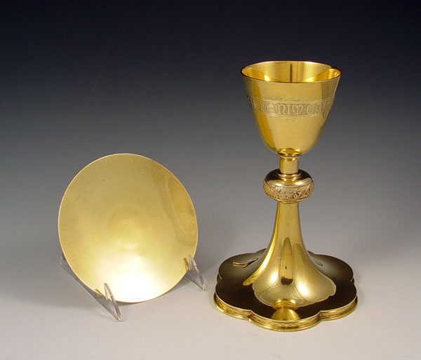 STERLING RELIGIOUS CORONATION CHALICE WITH SAUCER: Vermeil finish sterling by Creviston & Son, presented to Rev. Julius Leo Meyer, May 1st 1954. Inscribed with Latin phrase and grape and vine decoration. Comes with Coronation saucer as well. Chalice measures 8 3/4'' x 6'' dia. Saucer 5 7/8'' dia. Comes in presentation case, measures 7 1/8'' high x 9 3/4'' x 7 1/8. Approx 28.2 troy oz.