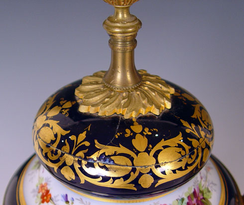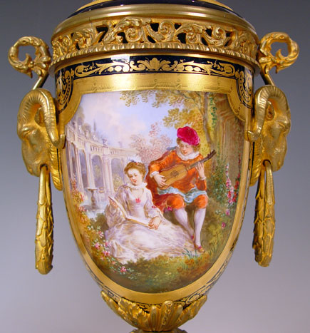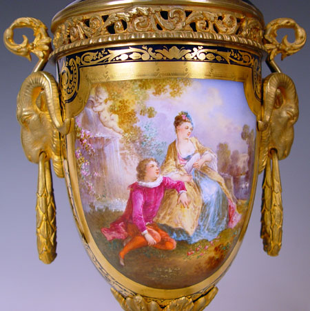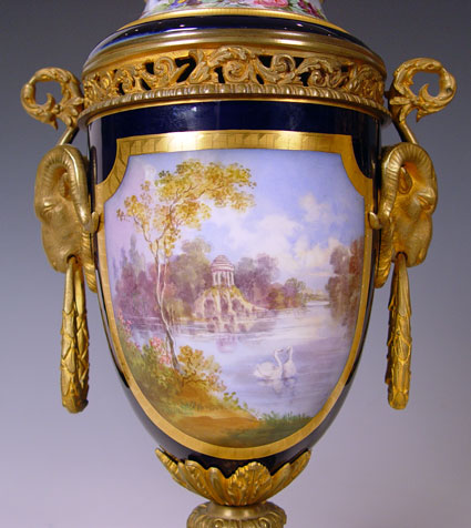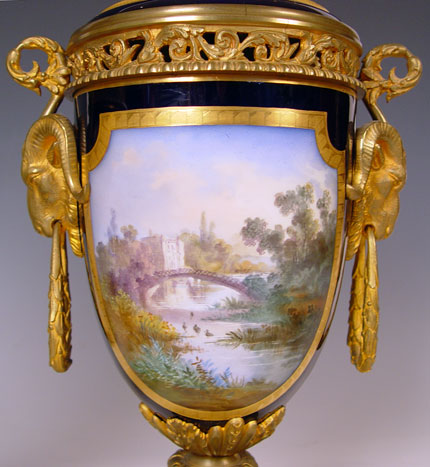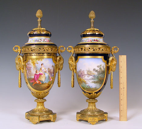 PAIR SIGNED SEVRES ORMOLU MOUNTED URNS OR COVERED VASES: Ringed nose lions head masqueron handles, cobalt ground with courting scenes and landscapes verso. Please note repair to the porcelain on the cover of one. 20 1/2'' high Late 19th early 20th C Est. $1200/1500**