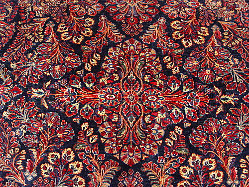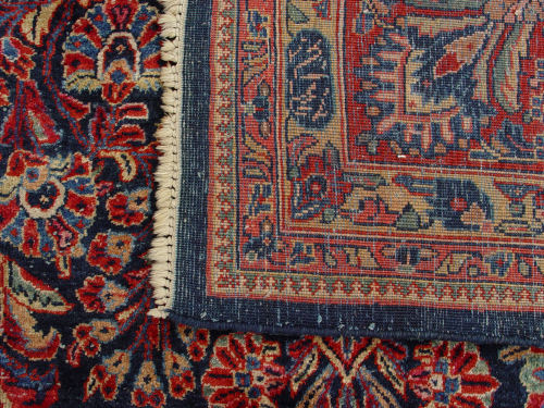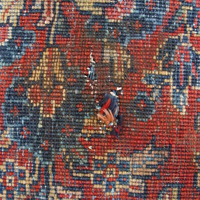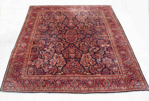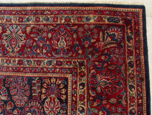 SAROUK CARPET: Approx 15' 7'' x 10' 8''. Red field, please note approx. 3'' hole in carpet. Est. $1500/2500**