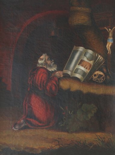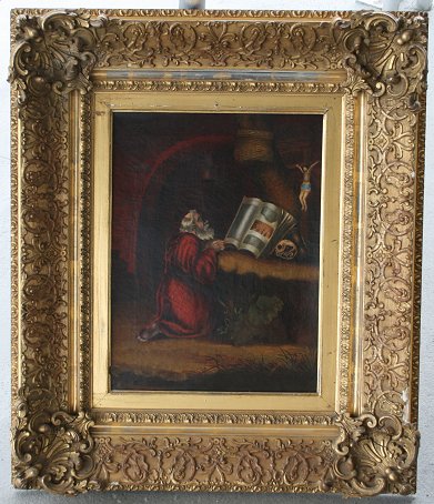 19th C RELIGIOUS OIL/C: Depicts a bearded robed man praying, 16'' x 12'', encased in an elaborate period carved and gilded foliate motif frame with minor wear, 27 1/2'' x 23''.