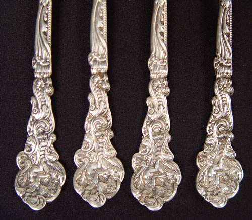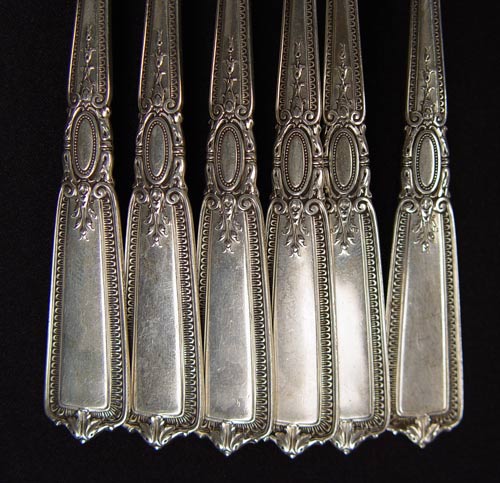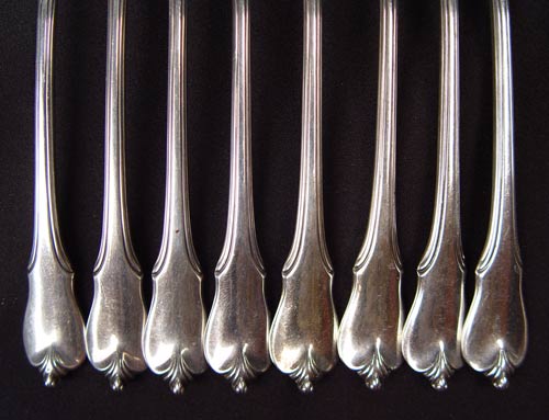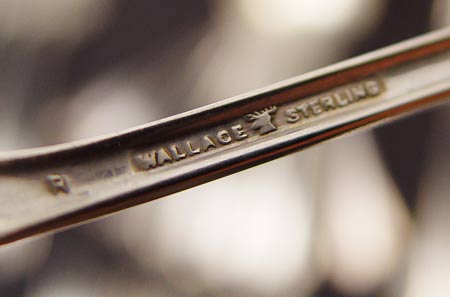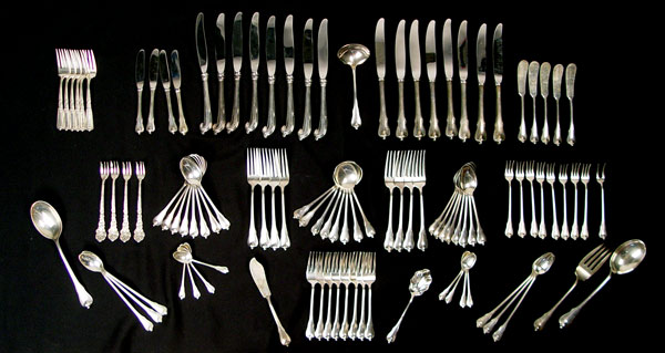 WALLACE GRAND COLONIAL STERLING FLATWARE SET: Approx. 91 pieces in the ''Grand Colonial'' pattern to include 8 forks (7 1/4'', note condition of one), 8 salad forks (6 1/2''), 16 teaspoons (6''), 8 round bowl soup spoons (6''), 6 iced teaspoons (7 1/2''), 8 hollow knives (8 7/8''), 8 hollow pistol handle knives (8 7/8''), solid master butter knife (6 7/8''), 5 solid butter knives (5 7/8''), 4 hollow butter knives (6 1/4''), 8 cocktail forks (5 1/2''), olive fork (5 1/2''), 5 demitasse spoons (4''), cold meat serving fork (8''), 2 tablespoons (8 1/2''), shell sugar spoon (5 7/8''), cream ladle (6''). Set also comes with 6 Wallace fruit forks in the ''Renaissance'' pattern and 4 ornate Gorham cocktail forks, not included in above count. Approx 101 total pieces. No monograms. Approx 93.1 troy oz. Comes in 2 drawer silver chest, note condition, measures 8 1/2'' high x 19'' x 13 1/2''.