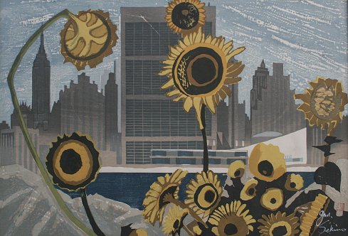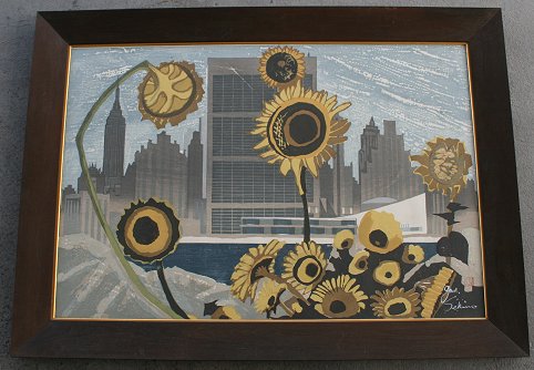 SEKINO, Jun'ichiro, (Japan, 1914-1988): City Scene ''NY & Sunflowers'', Wood Block, 97/100, sight size 22 1/4'' x 33 1/4'', custom wooden frame from Japan, 28 1/2'' x 39 1/4'', small paper affixed verso with artist signature and #97/100.