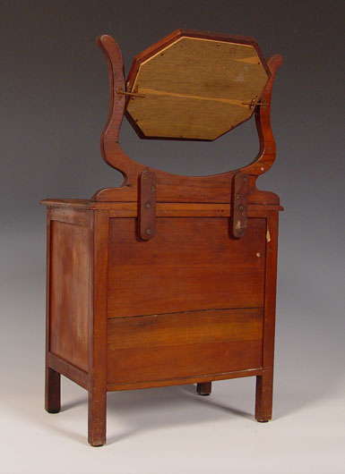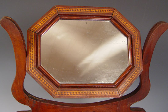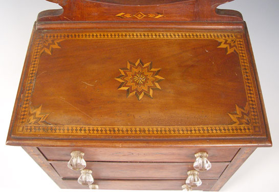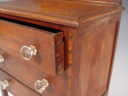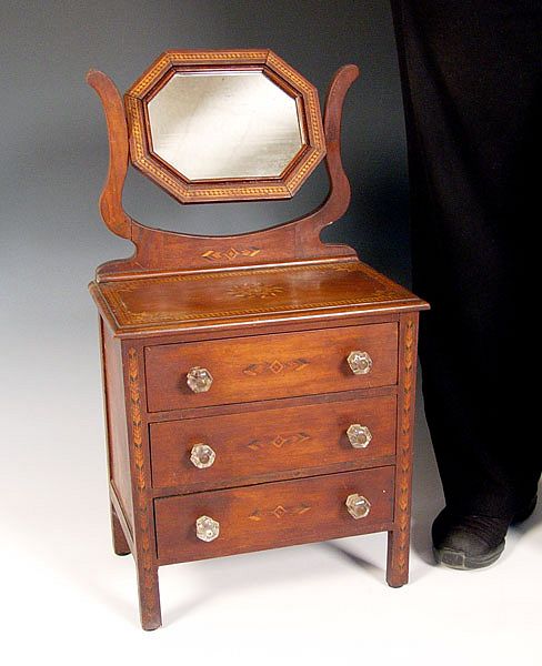 19th C MINIATURE PARQUETRY INLAY CHEST WITH MIRROR: Octagonal mirror over three drawers, glass knob, drawer stops in every drawer. 24 1/2'' x 14'' x 8 1/2''. Hand crafted for a well loved child.