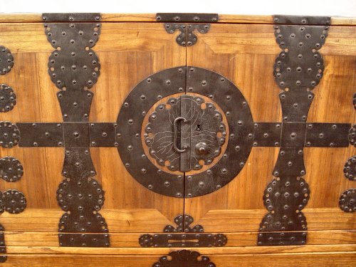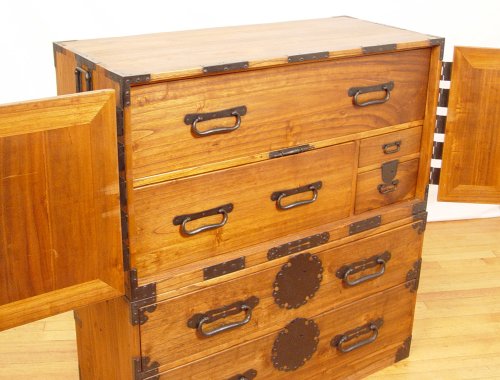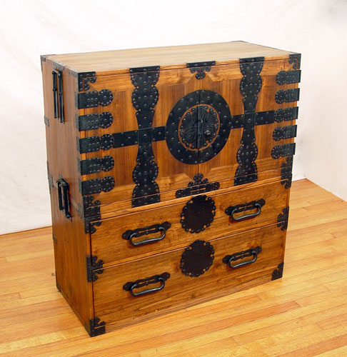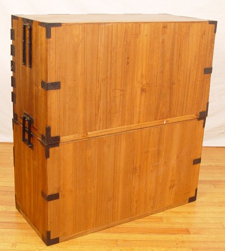 2 PART JAPANESE TANSU CHEST: Upper section with door, lower with drawers, Measures 40 1/2'' high x 37 1/2'' wide x 16 1/2'' deep. Please note condition, large scratch on top.