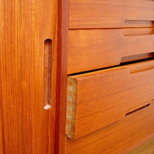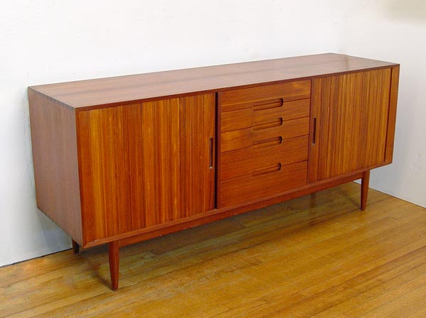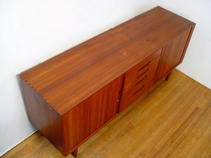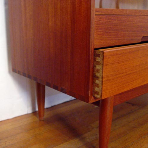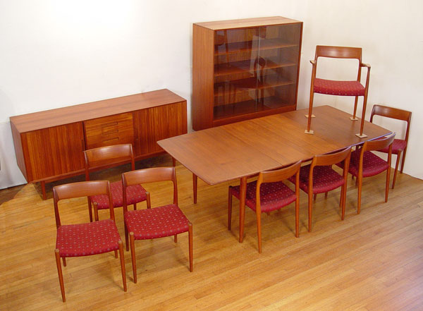 11 PIECE J.L. MOLLER DANISH MODERN DINING SET: Moller chairs and custom set made by Excellent Furniture Co. Copenhagen Denmark. All pieces were purchased at the same time in Copenhagen. Include BUFFET server 5 drawer center with flanking tambour doors, measures 31 1/2'' high x 71 1/4'' wide x 19 5/8'' deep. Glass front CHINA CABINET with 4 drawers and 3 shelves, measures 31 3/8'' high x 50'' wide x 18 1/8'' deep. 2 leaf dining TABLE, measures 29'' high x 35'' x 40 1/2'', leaves measure 15'' wide. 8 CHAIRS by J.L. Moller, 1 arm and 7 side, the arm chair measures 30'' high x 22'' wide x 19 1/2'' deep. Chairs are the only pieces with Moller label.