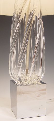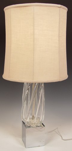 FINE MID CENTURY MODERN GLASS LAMP: Blown glass body, 17'' x 7'', on chrome plinth, 5'' x 5'', 33 1/2''h. overall, linen shade 15''dia x 17 1/2''.