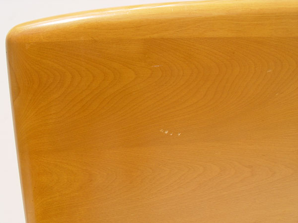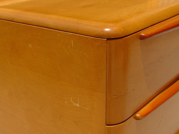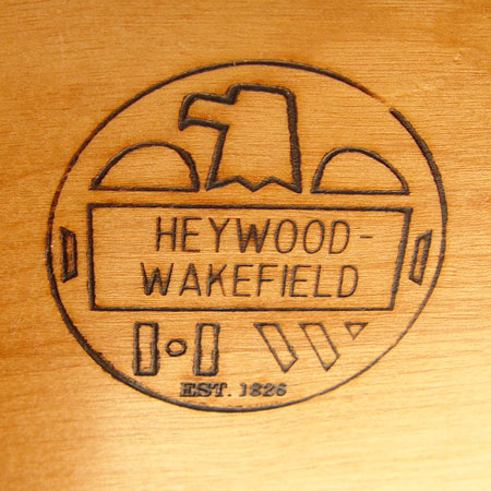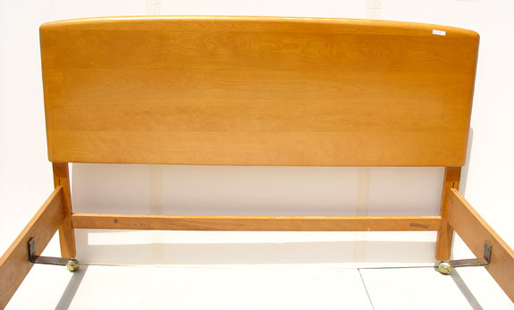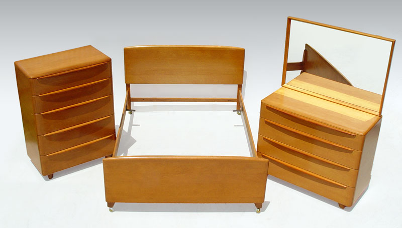 3 PIECE HEYWOOD WAKEFIELD CHAMPAGNE BEDROOM SET: To include 1) Headboard 57 3/4'' high x 57'' wide and footboard 25'' high. 2) 5 drawer chest of drawers measures 46 1/2'' high x 34'' wide x 19'' deep. 3) 4 drawer dresser with mirror measures 63 1/2'' high to top of mirror x 42'' wide x 20'' deep. Please note finish condition, call for condition.
