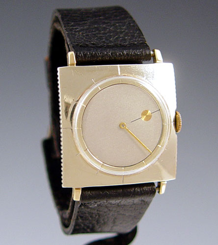14k ELGIN MYSTERY WRIST WATCH: Circa 1950, marked Elgin 23 Jewels 730 USA 6 ADJ, case marked 7516 14k Gold Wadsworth Cased and Timed by Elgin National Watch Co. Case measures 1 1/16'' x 1 3/8'' lug to lug, currently on a black leather? band with metal buckle, approx. 8 1/4''l. total. Watch running and seems to be keeping time.