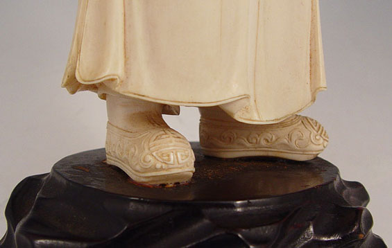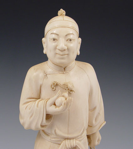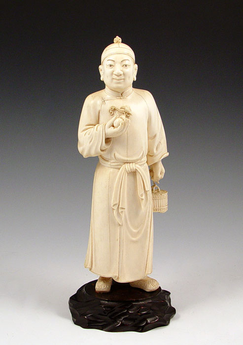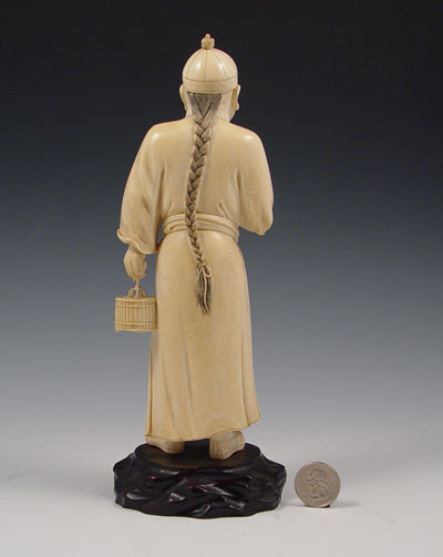 CHINESE CARVED IVORY FIGURE OF A MAN WITH BIRD AND CAGE: Finely detailed study of a man with long braid, bird on his chest and cage in his hand. 9'' high, excluding the wood stand.
