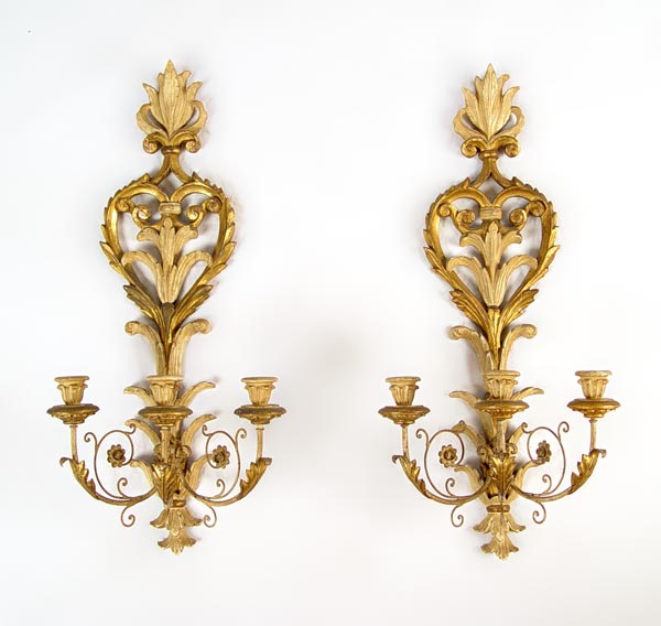 PAIR CARVED GILT WOOD AND GESSO 3 LIGHT WALL SCONCES
