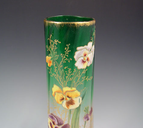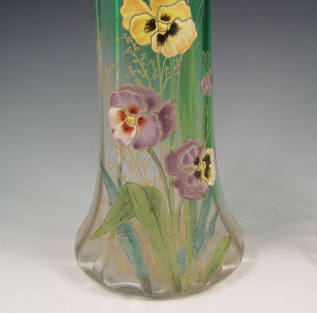 PAIR MONT JOYE QUALITY ENAMELED ART GLASS VASES: Pansy decorated, 11 5/8'' high x 4 7/8'' base dia.