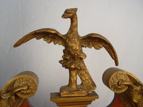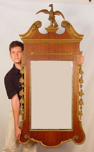 FINE EARLY 20TH C CHIPPENDALE FEDERAL STYLE PARCEL GILT MAHOGANY MIRROR: Broken pediment centered by a phoenix. Chip on upper corner of frame, 64'' x 27'' overall.