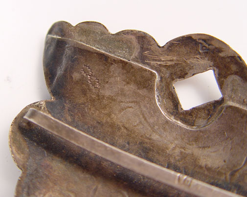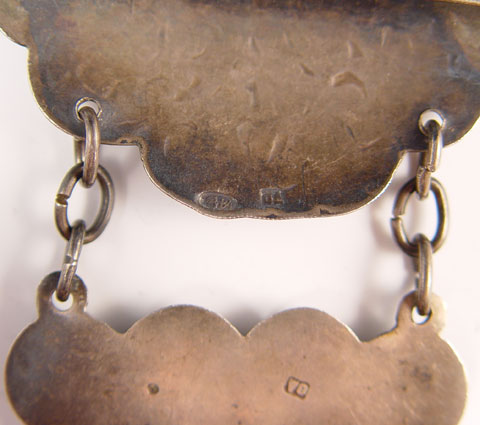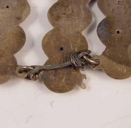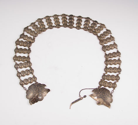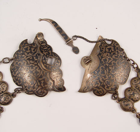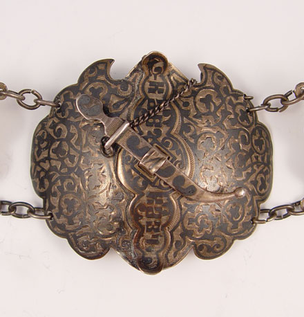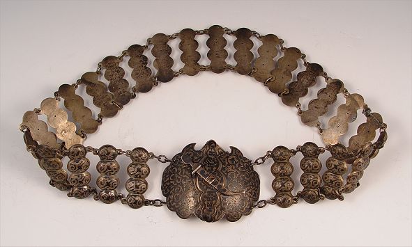 EARLY 20TH CENTURY KIEV RUSSIAN SILVER NIELLO BELT: 1908-1926 Kiev 84 zolotniks hallmark. Unknown makers hallmark ''OA''. Cyrillic inscription on buckle. Measures 33'' long x 2'' wide chain, 2 3/4'' wide buckle. Approx 8.2 troy oz. Note one clasp on one link broken.