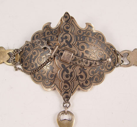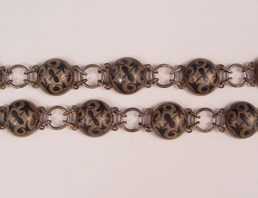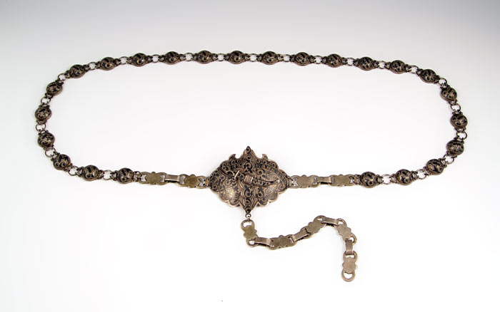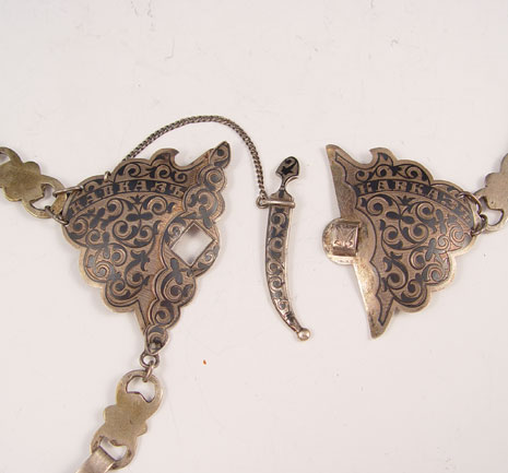 EARLY 20TH CENTURY MOSCOW RUSSIAN NIELLO SILVER BELT: Hallmarked with Alexander Domnin, turn of the century Moscow, 84 zolotnik. Cyrillic name on belt plate with addition hanger chain hanging from bottom of plate. Measures 42 1/4'' long overall. Approx. 6.2 troy oz.