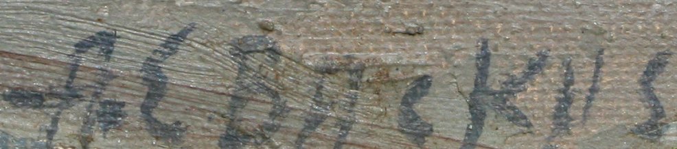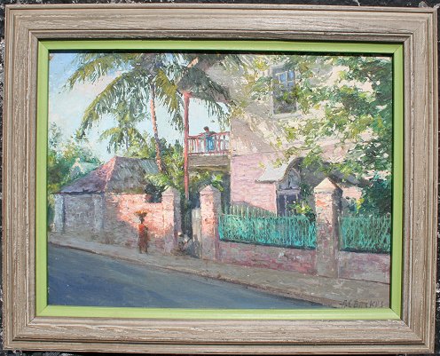 BACKUS, Albert ''Bean'' E. (American, 1906-1996): Street Scene with Figures, OIL/Board, 12'' x 16'', signed, framed, 16'' x 20''. Albert Backus is known as the artist who most influenced The Florida Highwaymen. From the estate of a South Florida collector. Est. $5000/8000**