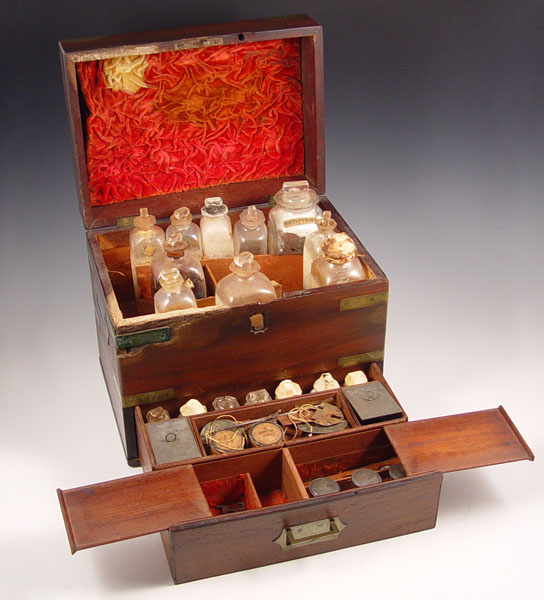 19TH CENTURY APOTHECARY OR CHEMISTS BOX WITH CONTENTS: Brass bound walnut box with lift top and drawer. The compartmented interior of the upper section is well worn. Approx. 20 bottles, some with labels such as Opium, Antipyrine, Goulards Extract, Scammony, Tartar Emetic, and compound dated 1887. There are also small wooden canisters with grain weights, drum weights and even most parts of the scale. The box is 10'' x 11.5'' x 8''.
