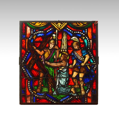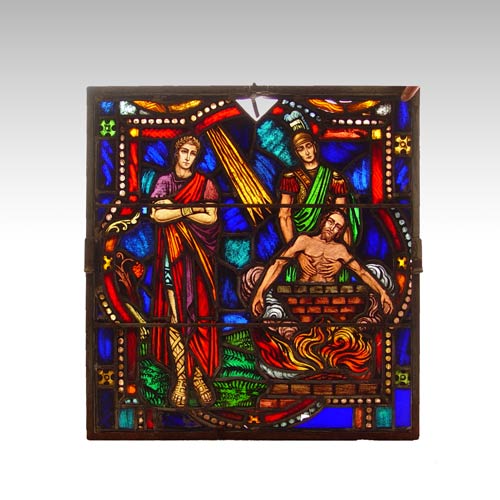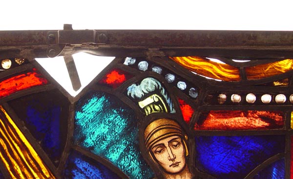 4 KARL MUELLER STAINED GLASS CHURCH WINDOWS: Each Approx. 33'' x 31''. KJ Mueller of Zephyrhills FL. brought these windows from the Mueller Studio in Germany. Karl J. Mueller is responsible for many historical church windows in Florida and is a direct descendant from Mueller Studios of Germany. Call for condition.