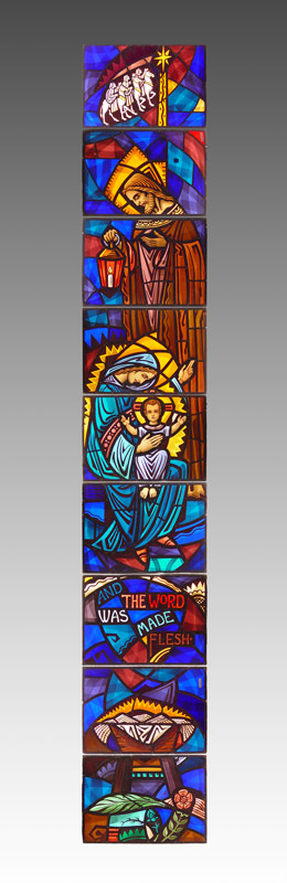KARL MUELLER STAINED GLASS CHURCH WINDOW AND THE WORD WAS MADE FLESH: Approx. 148'' x 23''. KJ Mueller of Zephyrhills FL. brought these windows from the Mueller Studio in Germany. Karl J. Mueller is responsible for many historical church windows in Florida and is a direct descendant from Mueller Studios of Germany. Call for condition.