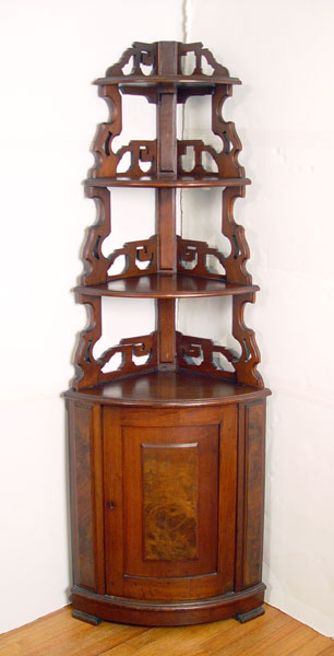 2 PART VICTORIAN CORNER ETAGERE: Burled walnut panels on lower cabinet, pierce back open shelving on upper. Measures 72 1/2'' high x 25 1/2'' wide x 17 3/4'' deep on each side.
