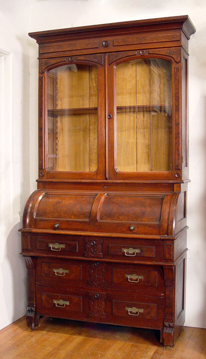 VICTORIAN RENAISSANCE REVIVAL WALNUT CYLINDER ROLL SECRETARY BOOKCASE: Burled wood panels and incised carvings. Upper section with adjustable shelf interior behind glass doors. Lower case with roll top desk over three full length drawers, one overhangs the others. The interior cubicles may be later. Measures 85 3/4'' high x 43 1/4'' wide x 22'' deep.