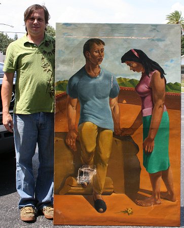 CASTRO, Pedro Leon, (Venezuelan, 20th C): Mural size Rivera style genre scene with an awkward moment between a male and female holding hands, OIL/C, 63'' x 39 1/4'', signed and marked lower left Pedro Leon Castro Caracas-Dicienbre 1954, unframed. Condition - Puncture lower left corner with visible paint fleck, scattered paint fleck throughout with pin point punctures and stretcher bar wear. Sold as is to the highest bidder. Est. $500/800**