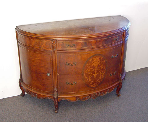 FRENCH MARQUETRY INLAY COMMODE: Early 20th C., walnut veneer. Three drawers flanked by side cabinet doors. Carved French cabriole legs and feet. Please note surface scratches. Measures 34 3/4'' high x 54'' x 23''.