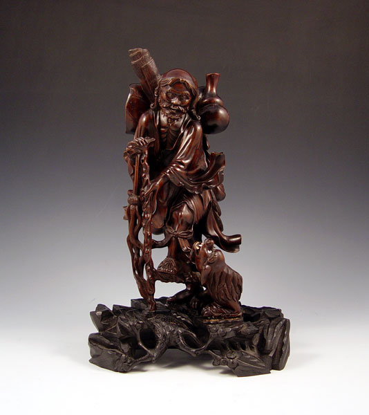 CARVED WOOD ASIAN FIGURE WITH DOG: Traveler with dog at his heels. The dog with glass eyes and bone teeth, the man with bone teeth. 14'' tall, 9'' dia.
