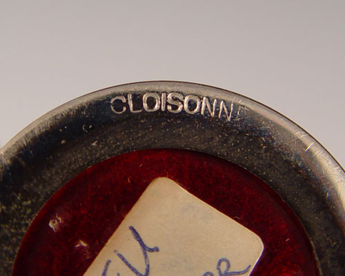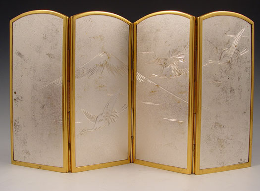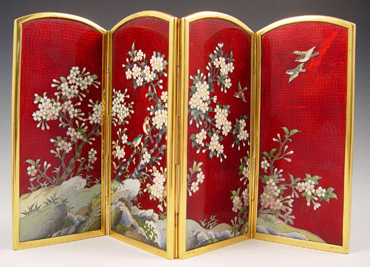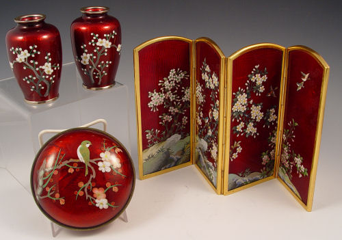 4 PIECE JAPANESE PIGEON BLOOD GINBARI CLOISONNE: 1) Round covered box, 4 1/2'' dia. 2) A four panel table screen, 8 1/2''h. x 13''. 3-4) A pair of 3 3/4'' vases.