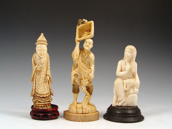 3 CHINESE CARVED IVORY FIGURES: 1) Man with basket of grapes and a rat, 7''h. 2) Lady Deity, 4 1/2''h. 3) Elder with pointy hat, 6''h. Heights exclude the bases.