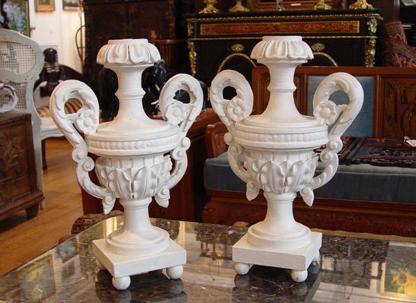 PAIR CARVED WOOD ARCHITECTURAL URNS: White painted finish, drilled as for lamps. Measure 16 1/4'' high x 11'' x 6 1/4''.