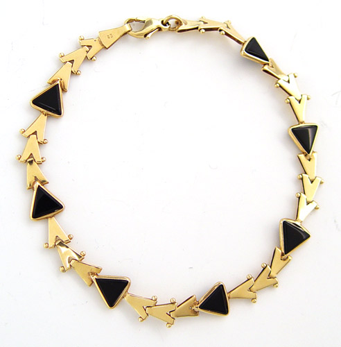 14K AND ONYX BRACELET: 14K yellow gold bracelet contains 7 triangle shaped black onyx tablets. Triangle shaped links. Lobster claw clasp. 5.4 grams. 7 3/4'' in length.