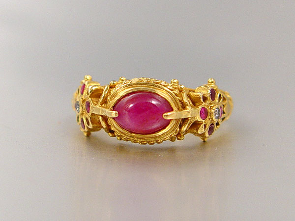 22K RUBY & DIAMOND RING: 22K yellow gold ring contains one oval cabochon cut ruby and 8 round mixed cut rubies. Total weight approx. 1.00 Ct. With 2 round full cut diamonds, approx. .02 Ctw. The rubies and diamonds are bezel set. Granular decoration. Weight: 7.4 grams.