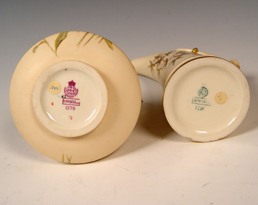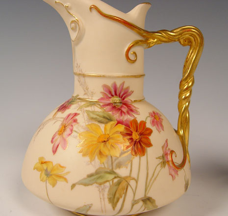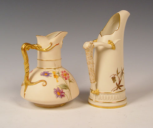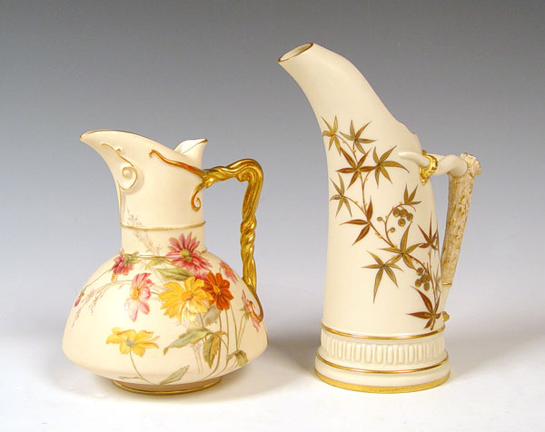 TWO 19th C ROYAL WORCESTER PORCELAIN PITCHERS: To include 1) 1886 date mark with antler form handle, measures 9'' high x 6 1/2'' 2) 1892 date mark pitcher with floral decoration, measures 7'' high x 5 1/2''.