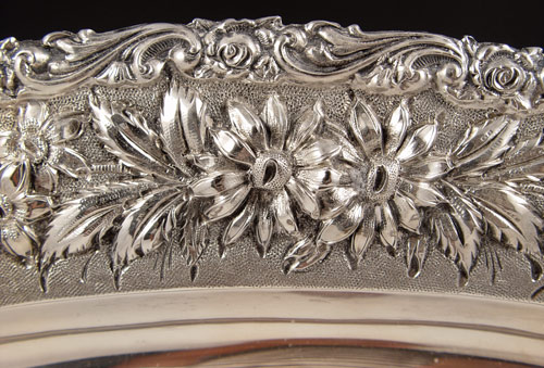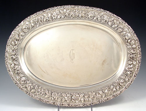 BALTIMORE SILVERSMITHS STERLING REPOUSSE OVAL TRAY: Repousse floral design rim, monogrammed, by the Baltimore Silversmith Mfg. Co. Note scratches. Measures 16'' x 12''. Approx 29.7 troy oz.
