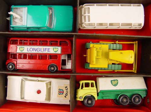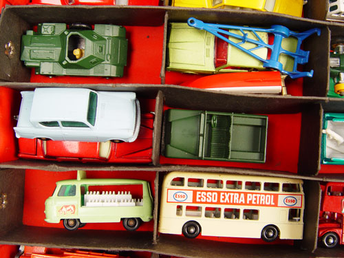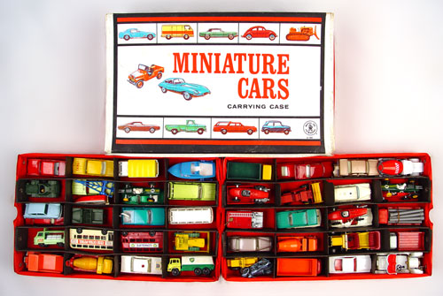 COLLECTION OF 51 VINTAGE LESNEY MATCHBOX CARS: Approx. 51 Lesney Matchbox cars, assorted makes & models. Includes cars, trucks, boats and race cars. All shows signs of play use. Comes in vintage 1966 Mattel plastic carrying case. Case measures 3 1/2'' x 13 1/4'' x 8 1/4''. Note condition.