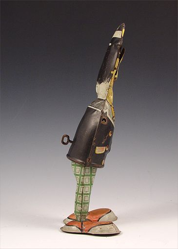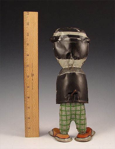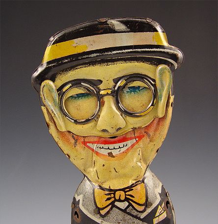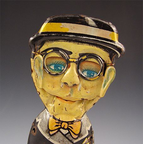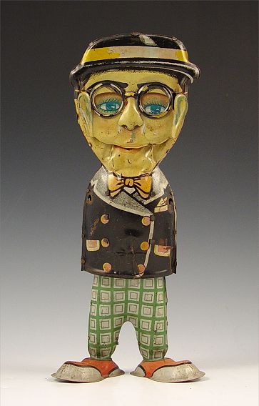 HAROLD LLOYD WIND UP HAPPY FACE TIN TOY: Circa 1929, Moving face moves from smile to frown as he moves. Working condition. From original owner. Note missing arms, isolated areas of decal loss and scratches, several dents. Measures 10 7/8'' high.