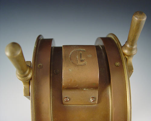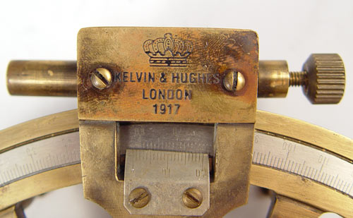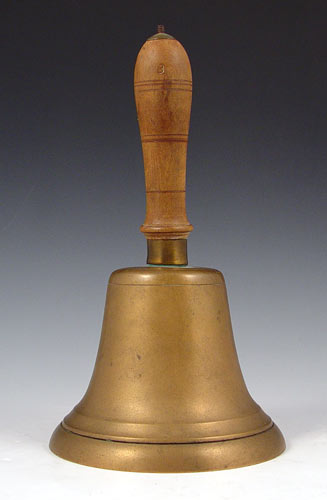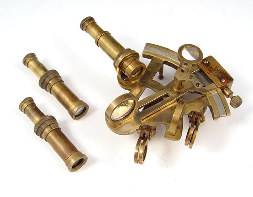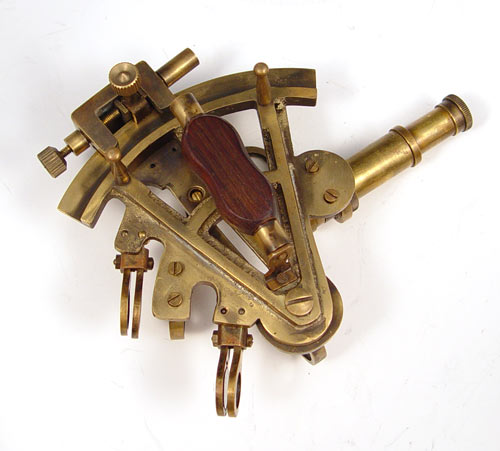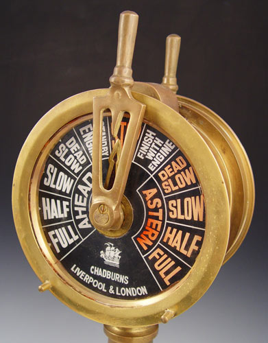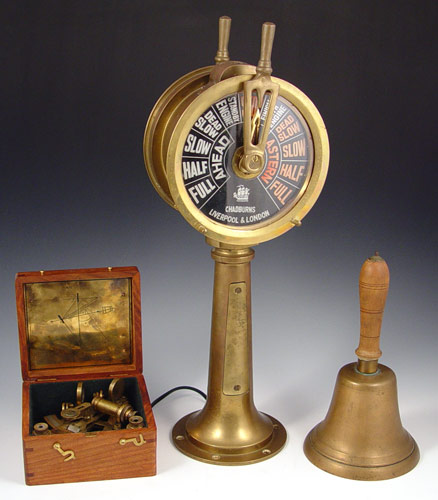 NAUTICAL COLLECTION SEXTANT, CHADBURNS TELEGRAPH & BELL: To include 1) Kelvin & Hughes nautical sextant dated 1917 in wood case. Case measures 3 1/2'' x 6'' x 5 1/2''. 2) Mid 20th century Chadburns brass case engine order telegraph, please note rewired, replacement screw on one lever. Missing one other screw. Measures 18'' high x 7 1/4'' top dia. 3) Brass bell with wood handle, note lean to handle. Measures 10'' high x 5 1/2'' dia.