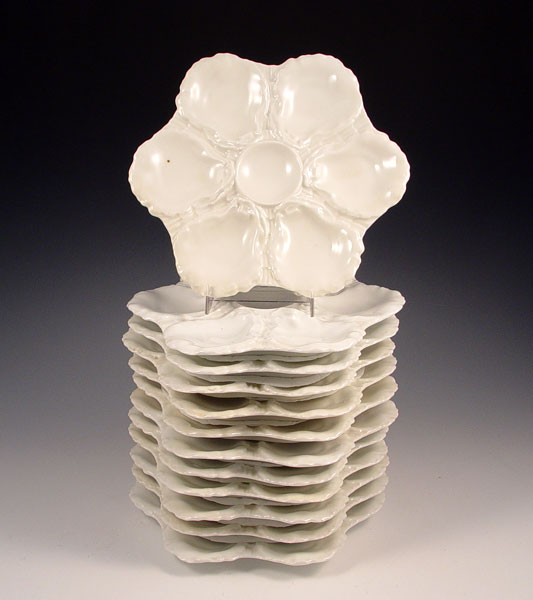 SET OF 12 HAVILAND & CO OYSTER PLATES: All white, green H&Co mark, 9'' dia.