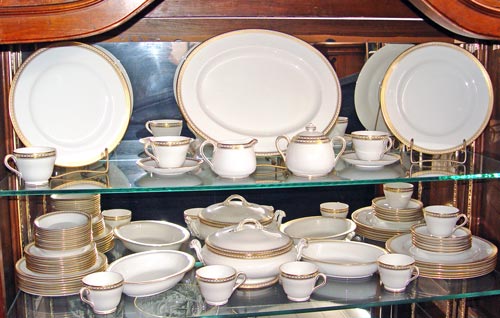 COPELAND SPODE ''GOLDEN BRACELET'' FINE CHINA: Service for 8, approx. 58 pieces to include 8 dinner plates (10 1/2''), 8 salad plates, 8 bread plates, 12 dessert bowls, 8 cups and 8 saucers. SERVING PIECES include the creamer, covered sugar, covered vegetable, 2 oval open vegetable bowls, and a 15'' platter.