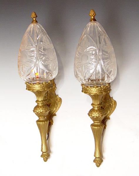 PAIR WALL MOUNT LAMPS WITH CUT GLASS SHADES: Gilt metal, the glass is pressed and cut. 26'' long, signed L&L WMC (L&L White Metal Corp.)