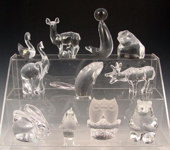 GLASS MENAGERIE SWEDISH CRYSTAL ANIMALS: 11 pieces to include 1) Mats Johansson beaver, 3 1/2'' high. 2) Unsigned elephant, 5 1/4'' high. 3) Orrefors rabbit with paper label, 3'' high. 4) Unsigned deer, note fleabites on base edge, 4 1/4'' high. 5) F. Wavling seal balancing ball, 5 1/4''. 6) Unsigned frosted owls on branch, 4'' high. 7) Granna glass swan with paper label, 3'' high. 8) Standing buck signed initials AT, 3 1/4'' high. 9) Penguin signed with initials, 3 3/8'' high. 10) Orrefors frog, signed, 3'' high. 11) Orrefors bear, signed 3 3/4'' high.