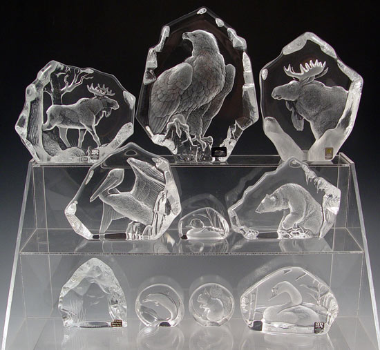 10 PIECE MATS JONASSON ENGRAVED GLASS ANIMALS: Heavy solid glass paperweights with animals engraved in back to include 1) Moose, 6 1/2'' high. 2) Bear, 4'' high. 3) Squirrel, 2'' high. 4) Duck, 1 1/2'' high. 5) Eagle, 7 3/4'' high. 6) Swan, 3'' high. 7) Pelican, 4 3/4'' high. 8) Full moose, 5 1/8'' high. 9) Dolphin, 2'' high. 10) Ekanas Swedish glass with fish, 3 3/8'' high.