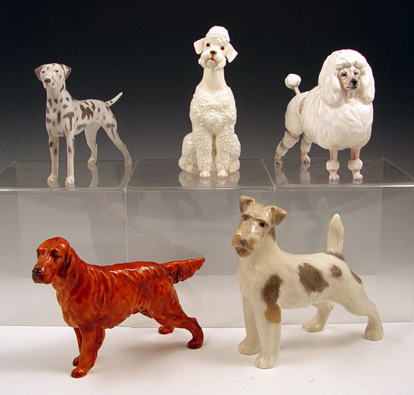 5 FINE PORCELAIN DOGS INCLUDE DOULTON AND ROYAL COPENHAGEN: 1) Royal Doulton Irish Setter 1055, 5 1/2'' tall 2) French Poodle 2631, 5 1/2'' tall 3) Royal Copenhagen Dalmatian, 3501, 5'' tall, 4) Royal Copenhagen Terrier, 6 1/2''h. 5) German JR French poodle, 6 1/2''h.