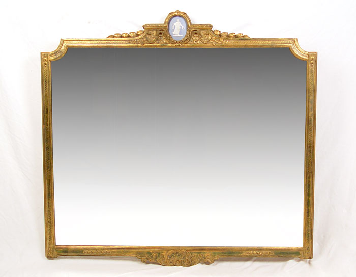 GILTWOOD MIRROR WITH JASPER PLAQUE: Carved frame with Jasperware plaque on crown. Frame measures 45 1/2'' x 47 1/2''. Mirror measures 35'' x 44 1/4''.