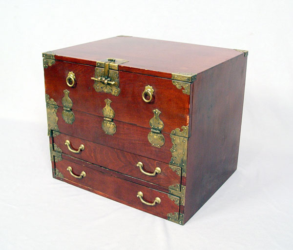SMALL CHINESE CHEST: Single door over 2 drawers. Brass hardware and decoration. Measures 14 1/4'' high x 16 3/4'' x 14''.