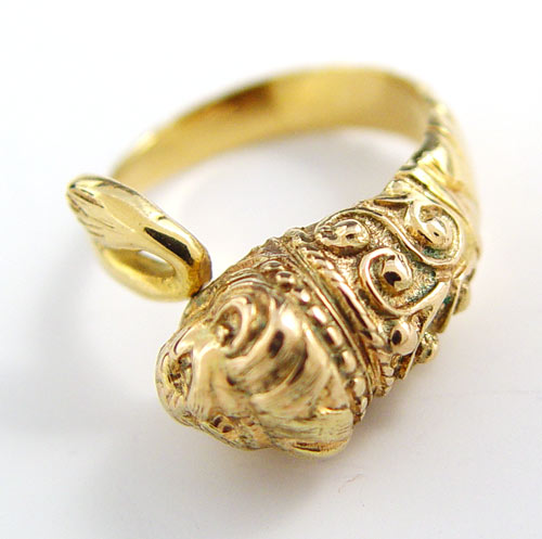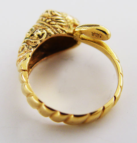 18K FOO DOG FIGURAL RING: 18K yellow gold ring depicting a foo dog. By-pass design. Weight: 7.3 grams. Size 7
