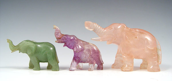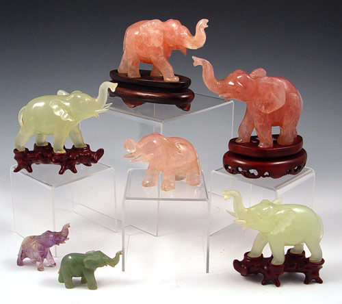 GROUP OF 7 CARVED STONE ELEPHANTS: 3 rose quartz, 1 amethyst, and 3 serpentine jade, 2'' - 4''h. Four are sold with wood stands.