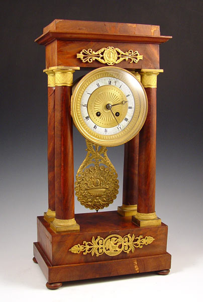FRENCH WOOD & GILT METAL DECORATED PORTICO CLOCK: Portico clock with gilt medal decoration on case. Metal face with porcelain rim, note cracks to porcelain. Beveled bubble glass bezel. Gilt metal pendulum, no key. Note veneer chips to case, missing bell. No visible makers name. Measures 18 3/4'' high x 9 3/8'' wide x 6 1/8'' deep.