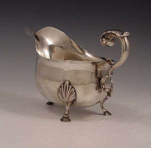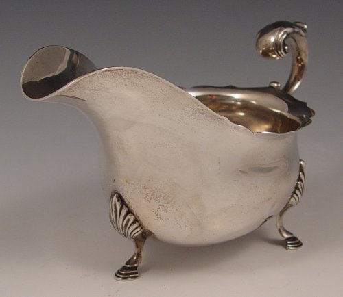 CURRIER & ROBY STERLING GRAVY BOAT: On three legs. Measures 4 1/4'' high x 7 1/4'' long. Approx 9 troy oz.