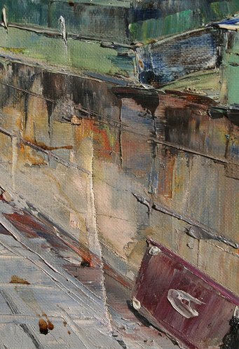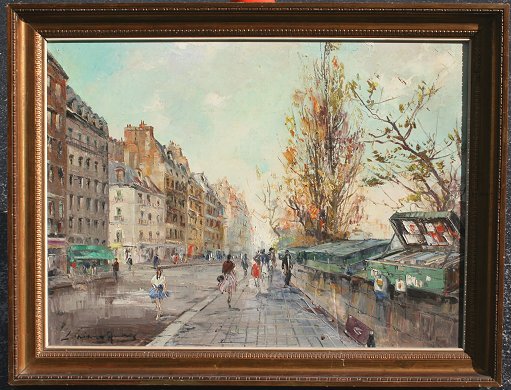 ILLEGIBLY SIGNED FRENCH IMPRESSIONIST PARISIAN STREET SCENE: OIL/C, 23 1/2'' x 32'', gilded frame with wear, 28'' x 36''. Condition - Needs cleaning, abrasion with puncture in lower right quadrant.